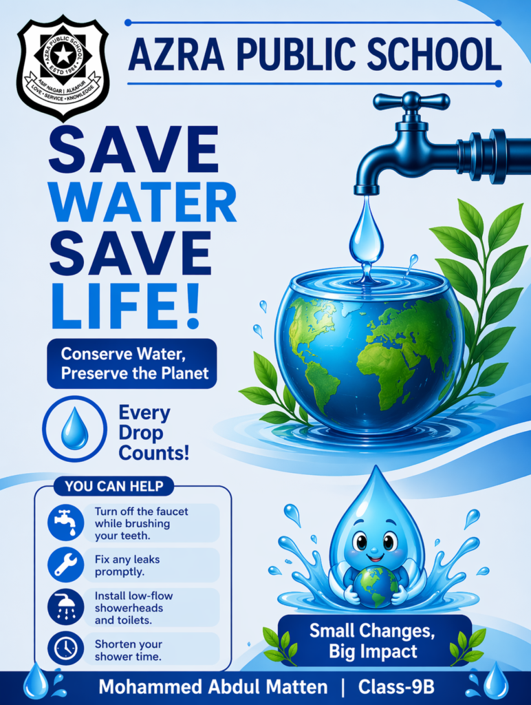 The poster by Azra Public School beautifully highlights the importance of water conservation. The image of a tap releasing a single drop into a globe reminds us that every drop of water contributes to sustaining life on our planet. It clearly shows that wasting water is equal to wasting life itself.